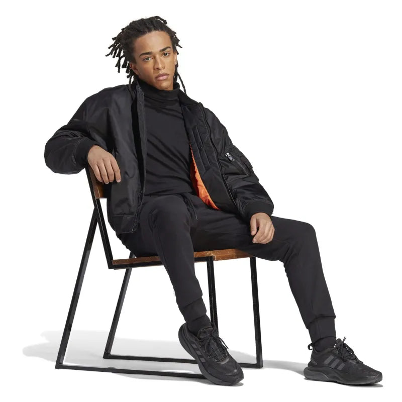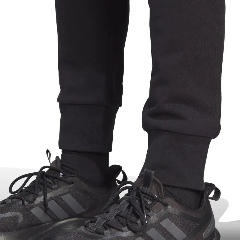 Black sweatpants are made of pleasant material with a proportion of cotton, which makes them comfortable to wear. They have a tapered cut and are finished with cuffs at the bottom. The advantage is the elastic waistband with drawstrings. There are open pockets for small items on the sides of the men's sweatpants. There is also an embroidered adidas logo under the pocket.