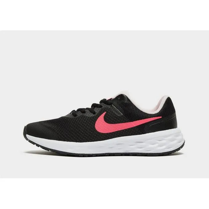 Get moving with these juniors' Revolution 6 trainers from Nike. Coming in a Black colourway, these low-profile runners are made from a breathable and partly recycled textile upper with synthetic overlays for durability. They feature a lace fastening with a padded ankle collar for a snug fit and have a reinforced toe for lasting wear. Underfoot is a soft foam midsole for lightweight cushioned comfort as well as a rubber outsole for total traction. They're signed off with the Swoosh to the sidewalls.