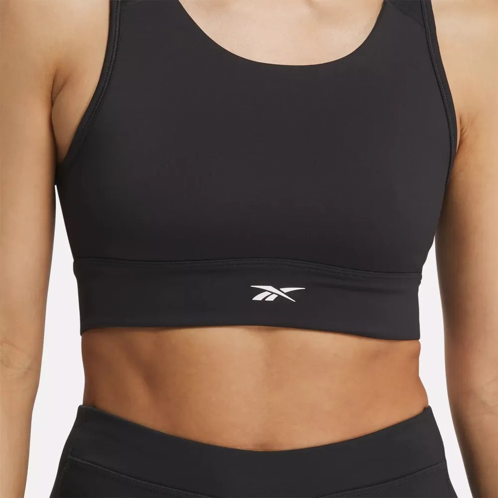 From kickboxing to HIIT, this Reebok workout bra provides high support for your most challenging sessions. A high neckline provides coverage, while a cutout in back adds feminine detail. RBK-DRY wicks sweat to keep you dry as you raise the intensity.